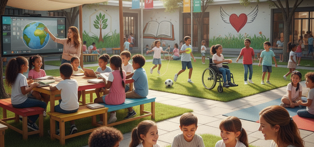 توفر المدرسة بيئة تعليمية صحية، وتقدم التثقيف الصحي، وتشجع على النشاط البدني، وتتعاون مع الأهل لتقديم الدعم اللازم.